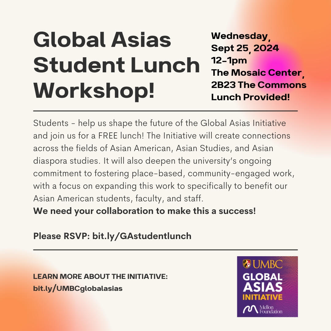 Students -- help us shape the future of the Global Asias Initiative and join us for a FREE lunch! The Initiative will create connections across the fields of Asian American, Asian Studies, and Asian diaspora studies. It was also deepen the university's ongoing commitment to fostering place-based, community-engaged work, with a focus on expanding this work to specifically benefit our Asian American studies, faculty, and staff.
